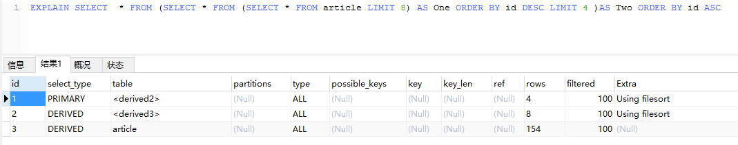 EXPLAIN SELECT  * FROM (SELECT * FROM (SELECT * FROM article LIMIT 8) AS One ORDER BY id DESC LIMIT 4 )AS Two ORDER BY id ASC